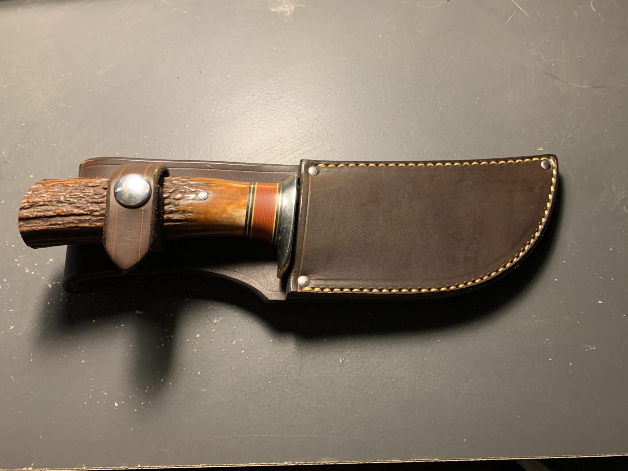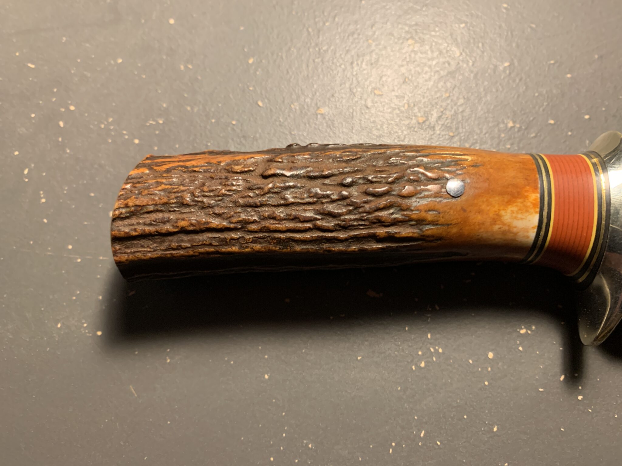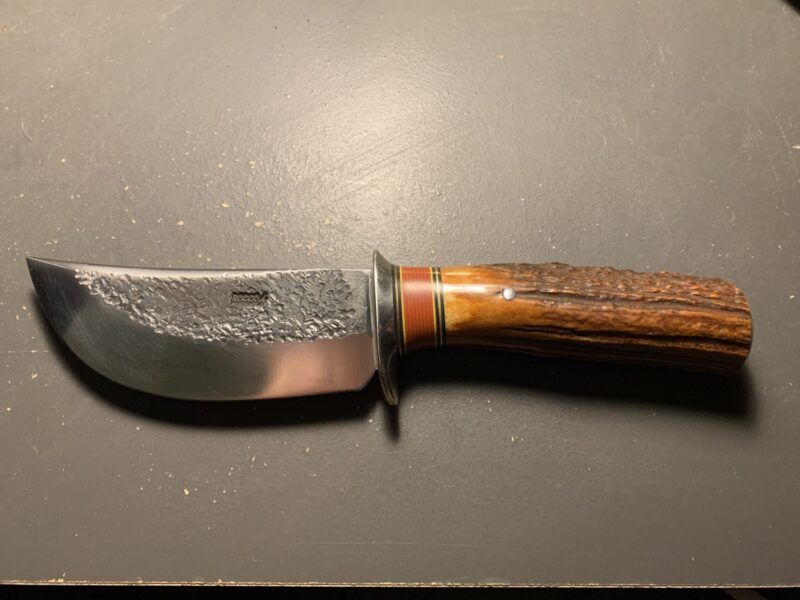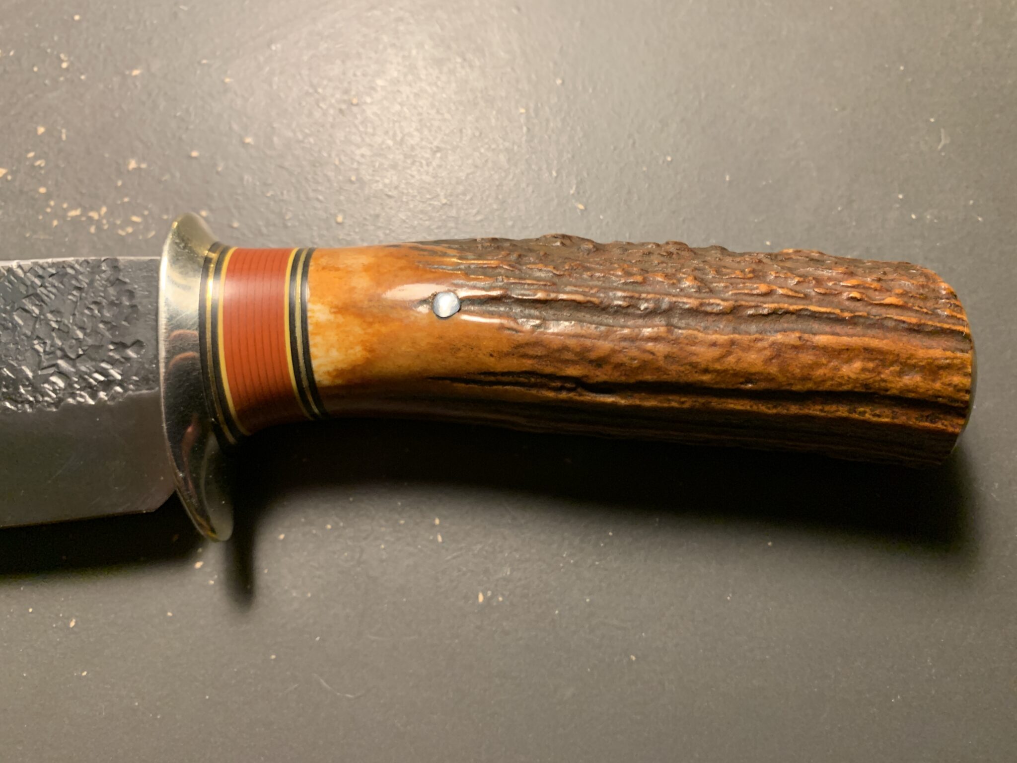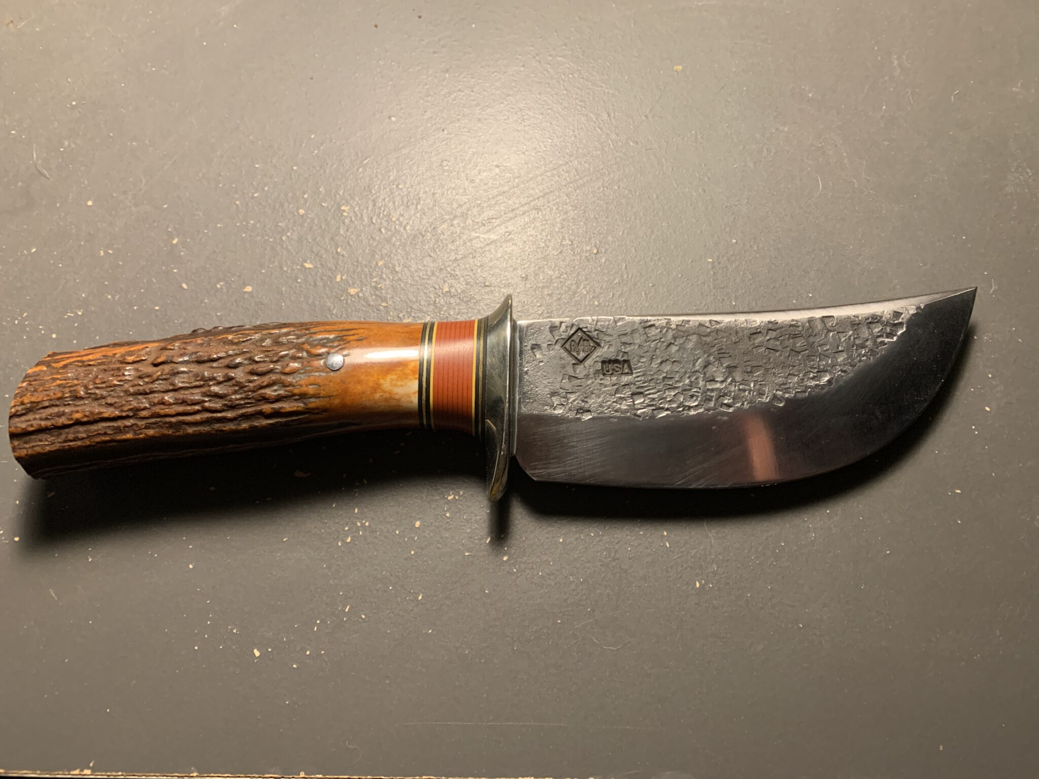 This knife is handmade by Brian Nawrocki (Rocco Handmade) who apprenticed under Jim Behring (Treeman Knives) in Michigan. The knife is hand forged from 1095 high carbon steel. The knife has a 5″ skinner style blade that is hammer marked, 3/16″ thick blade, 10″ overall with a premium red stag handle pinned, nickel silver guard silver soldiered to the blade. The leather sheath is a Treeman Leather sheath. Brian apprenticed under Jim Behring and his knives are made in Jim’s shop in Michigan. This is a beautiful example of a true handmade custom knife. So many are mid tech or machined these days, getting harder to find well made hand forged custom knives these days. This knife is similar to Treeman’s or Randall Made quality. The knife is new, unused, not carried or sharpened.