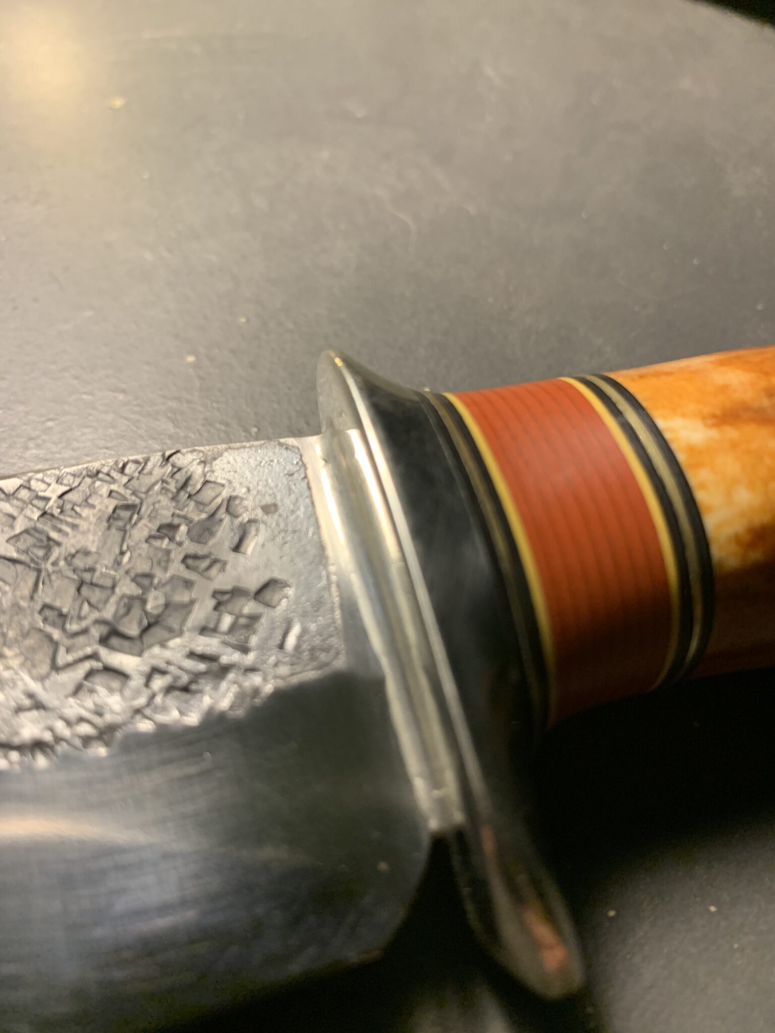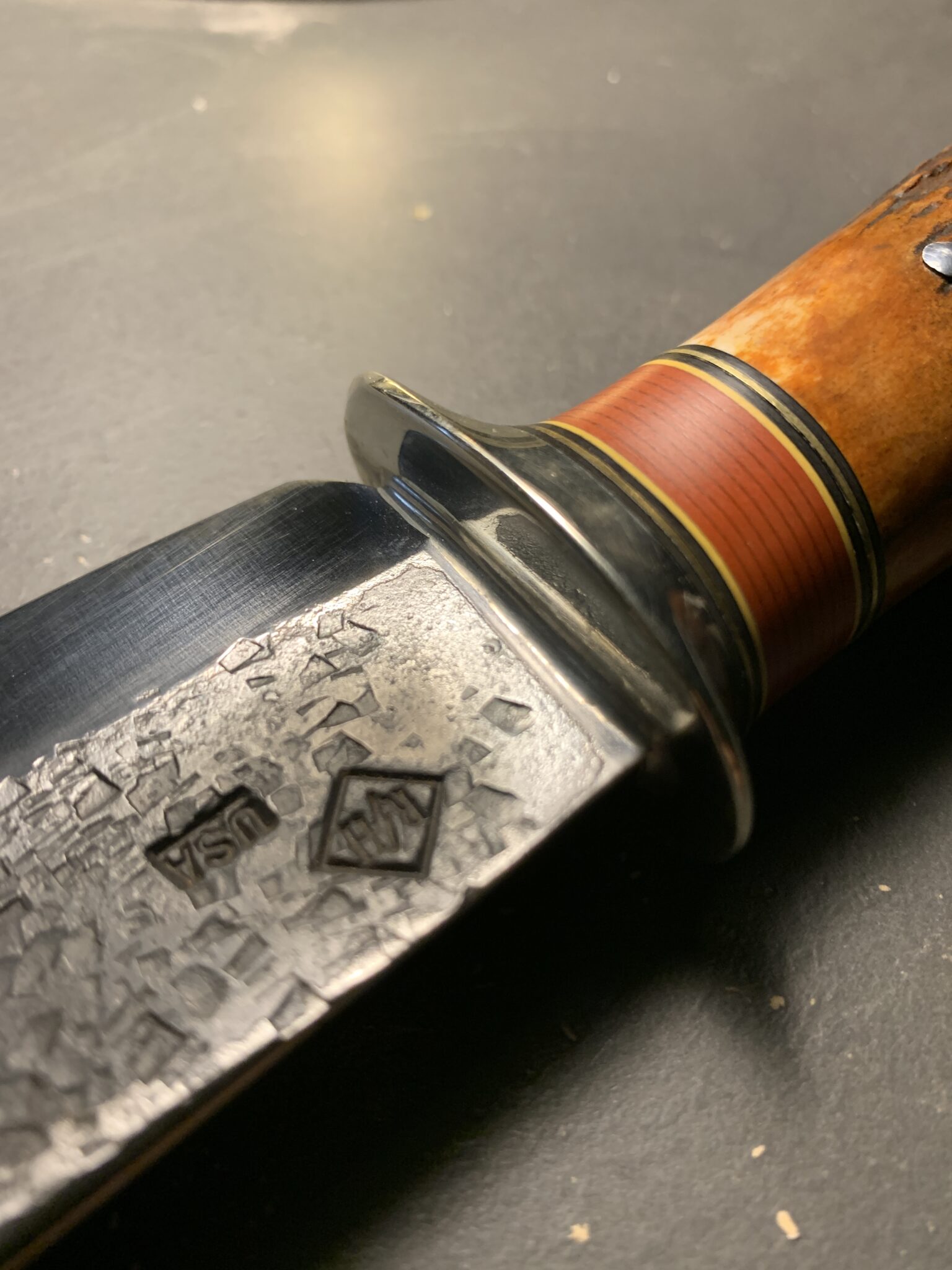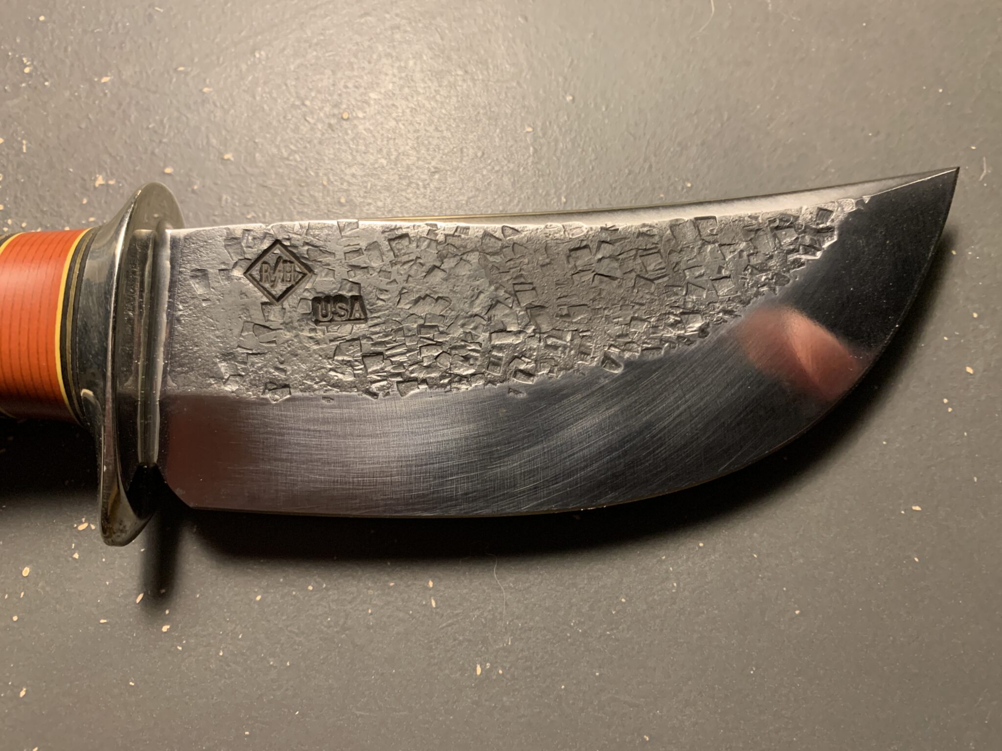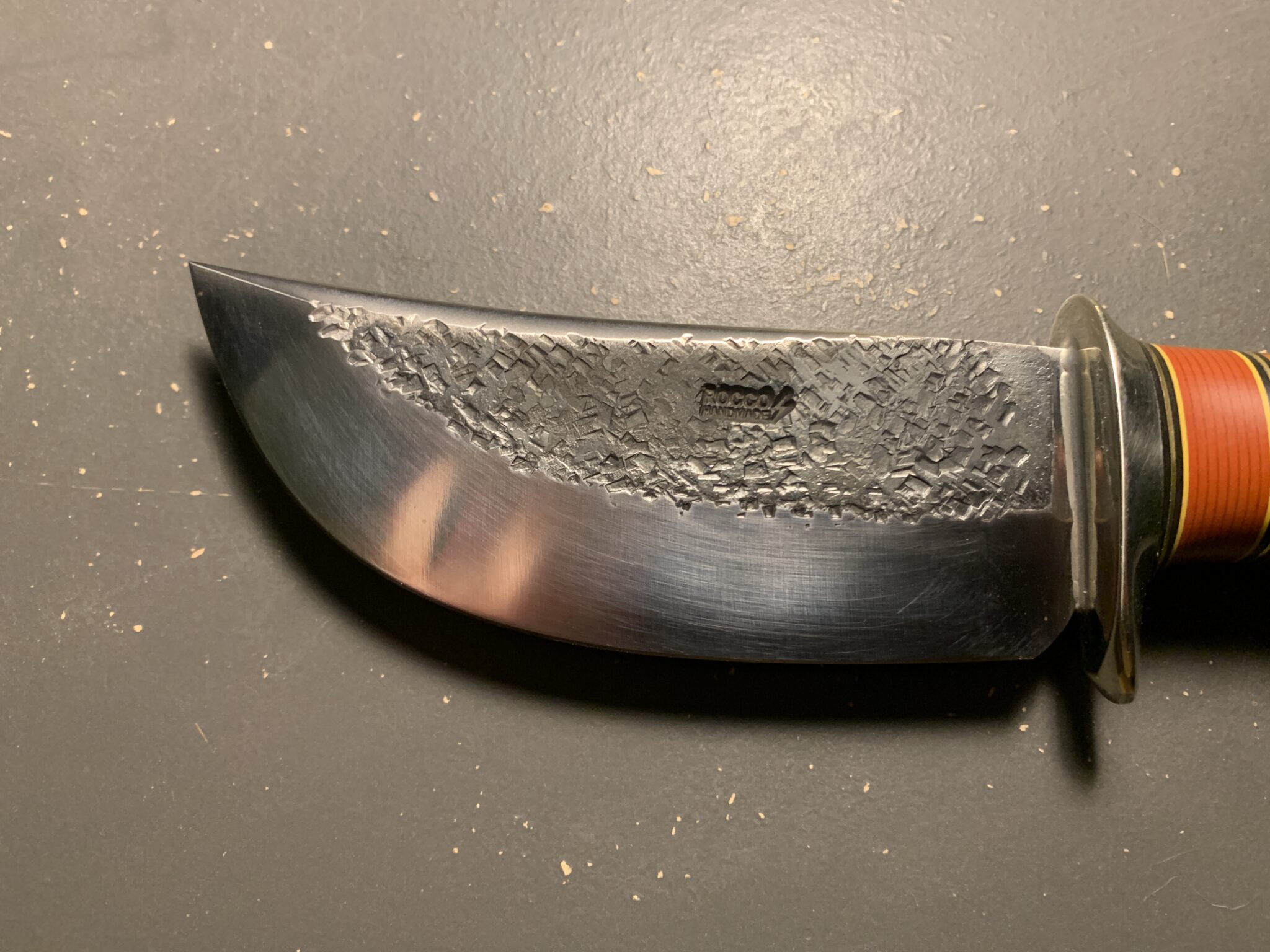 This knife is handmade by Brian Nawrocki (Rocco Handmade) who apprenticed under Jim Behring (Treeman Knives) in Michigan. The knife is hand forged from 1095 high carbon steel. The knife has a 5″ skinner style blade that is hammer marked, 3/16″ thick blade, 10″ overall with a premium red stag handle pinned, nickel silver guard silver soldiered to the blade. The leather sheath is a Treeman Leather sheath. Brian apprenticed under Jim Behring and his knives are made in Jim’s shop in Michigan. This is a beautiful example of a true handmade custom knife. So many are mid tech or machined these days, getting harder to find well made hand forged custom knives these days. This knife is similar to Treeman’s or Randall Made quality. The knife is new, unused, not carried or sharpened.